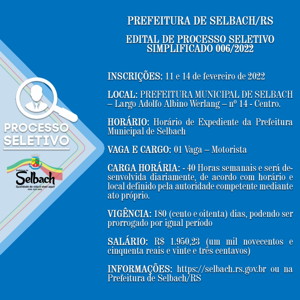 Mais informações no link https://selbach.rs.gov.br/system/filemanager/files/concursos_anexos_145_471_1644415621.pdf