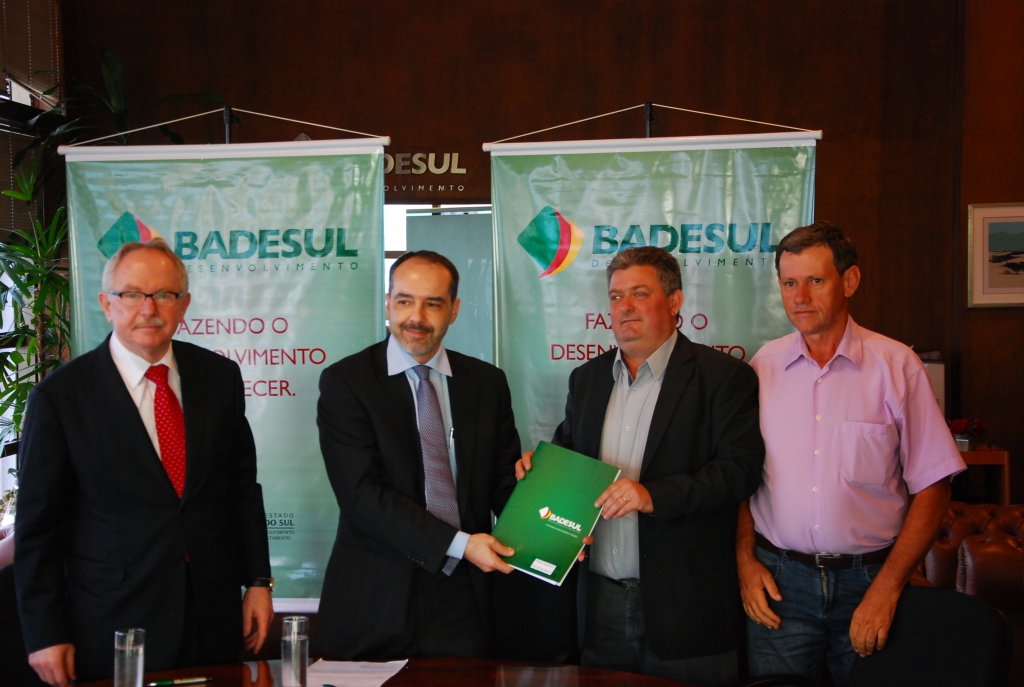 Na última segunda feira (1º), o Prefeito Sérgio Ademir Kuhn esteve se deslocando a Porto alegre, e assinou juntamente com 6 municípios gaúchos, o convênio de infraestrutura urbana (asfaltamento), no valor de R$ 700 mil reais, oriundos do PIMES-Badesul. As prioridades serão as ruas 13 de Maio (entre a Rua Arnilo Alfredo Maldaner e Rua Boa Esperança), Rua Arnilo Alfredo Maldaner (entre a Avenida Jacuí e Rua 13 de Maio), Avenida 25 de Julho (entre a Avenida Jacuí e Rua 13 de Maio), Rua Machado de Assis (entre a Avenida Jacuí e Rua 13 de Maio), Rua João XXIII (entre a Avenida Jacuí e a Rua 13 de Maio), Rua Barão do Rio Branco (entre a Avenida Jacuí e Rua 13 de Maio), Rua Coronel Selbach (entre a Avenida Jacuí e a Rua 13 de Maio), Rua Boa Esperança (entre a Avenida Jacui e a Rua 13 de Maio), Rua Barão do Rio Branco (entre a Rua XV de Novembro e a Avenida Jacuí). Foto: Presidência BADESUL, Prefeito Sérgio Ademir Kuhn, Coordenador de Obras Boneimar Bennder.