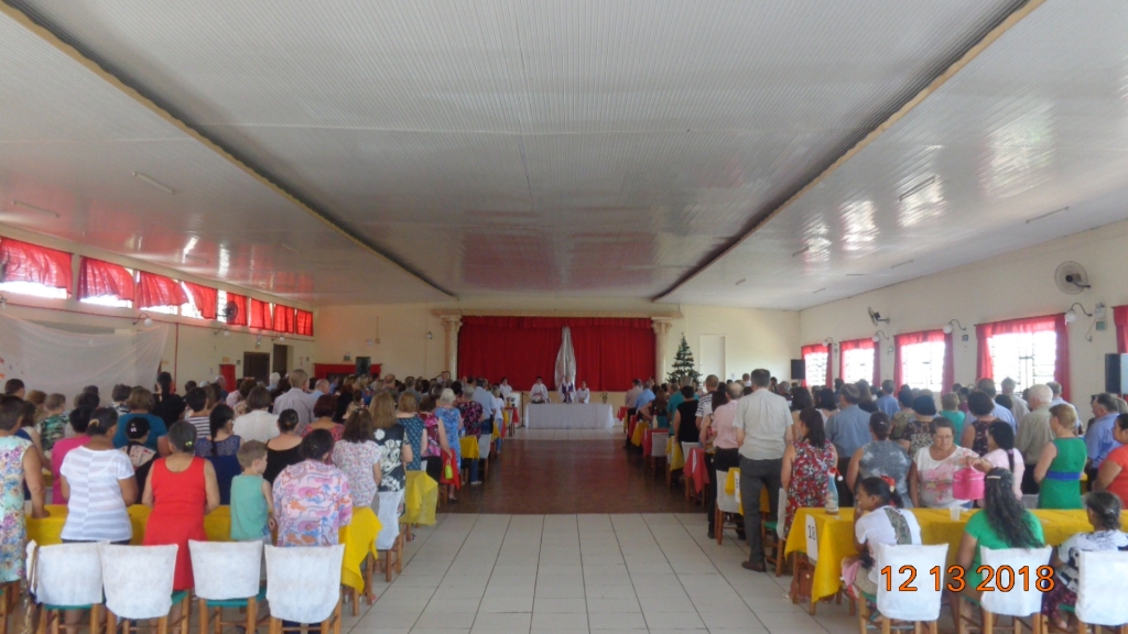 Além da tarde agradável, que iniciou com missa de celebração ao Natal Cristão realizada pelo Padre Aloisio e contou com a presença do Prefeito Municipal Serginho Kuhn e demais secretários municipais, os idosos puderam se descontrair com a apresentação cultural das irmãs Kemily e Kaiany Gueller e após servido o café as 350 participantes, ocorreu a chegada do papai-noel com distribuição de presente a todos.