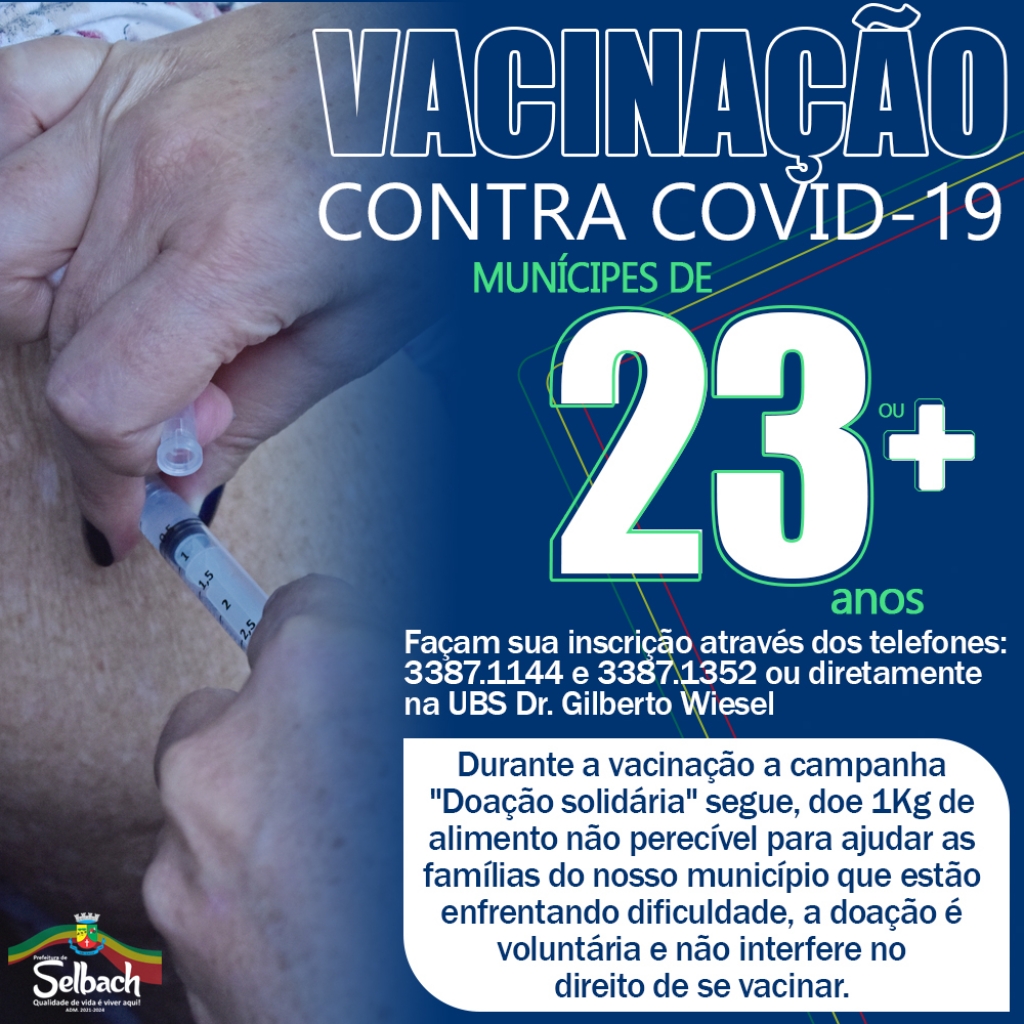 Nesta terça-feira (10) começa o agendamento para a aplicação da 1ª dose de vacina contra a Covid-19 para munícipes com 23 anos ou mais.