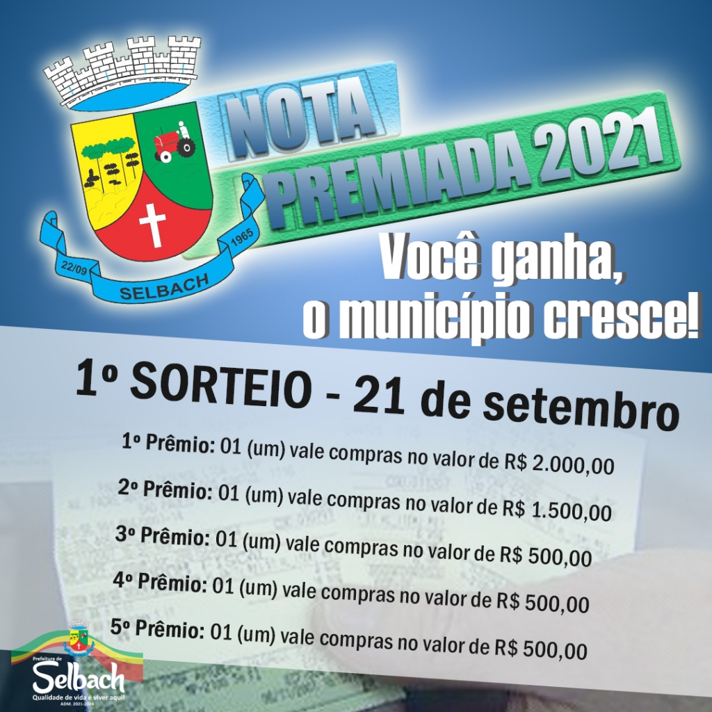 Acontece na terça-feira, dia 21 de setembro, o primeiro sorteio da Nota Premiada 2021, que distribuirá R$ 5 mil vale compras, divididos em 5 prêmios: R$ 2 mil para o 1º, o 2º ganhará R$ 1.500 e o 3º, 4º e 5º serão comtemplados com R$ 500 cada.