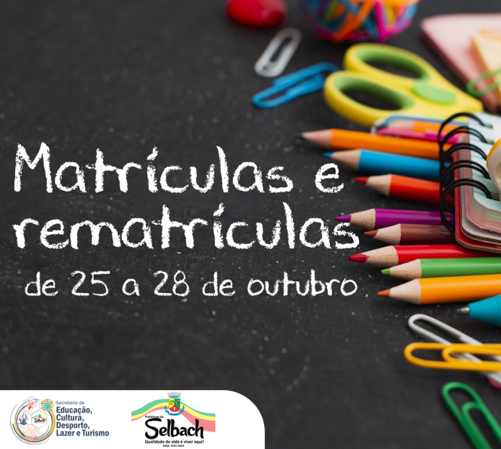 A Prefeitura de Selbach, por meio da Secretaria de Educação, Cultura, Desporto, Lazer e Turismo, divulga o período de matrículas e rematrículas para alunos da Rede Municipal de Ensino, iniciando na próxima segunda-feira (25) até a quinta-feira (28), conforme Edital nº 010. Ambos os procedimentos são realizados nas próprias escolas.